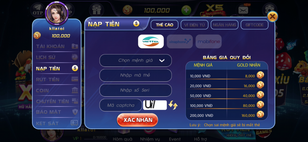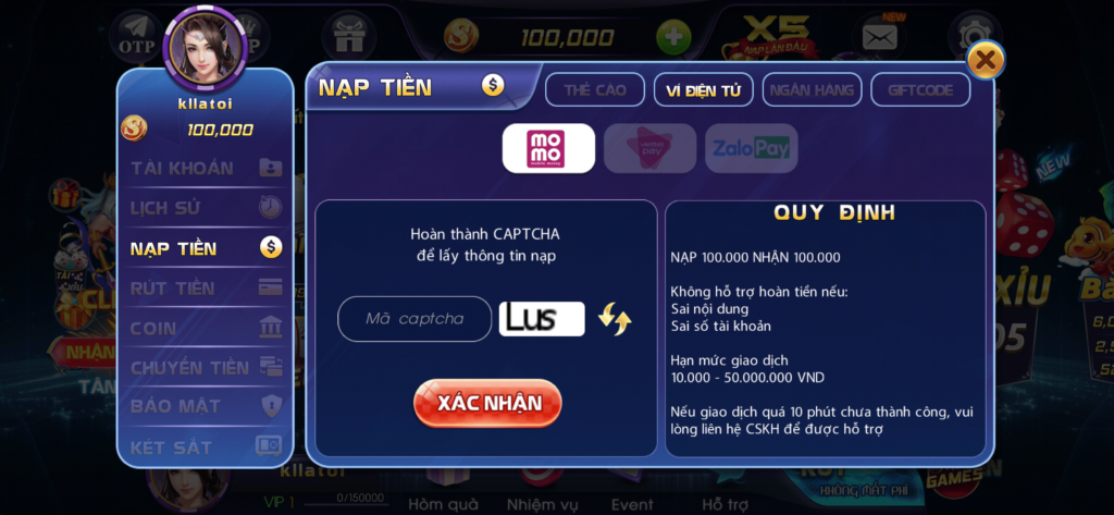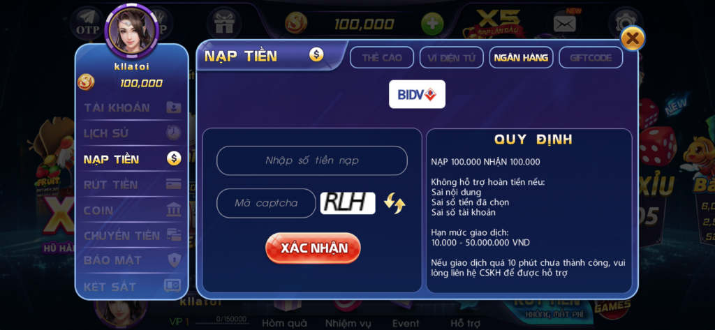 - Nhập số tiền cần nạp + mã captcha → chọn Xác nhận